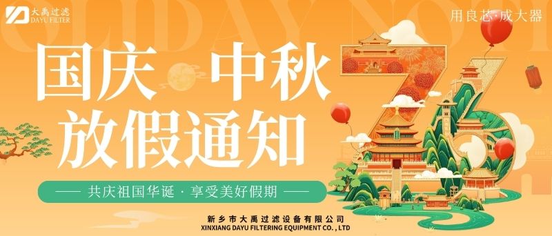 尊敬的客戶及合作伙伴:秋風(fēng)送爽,丹桂飄香。值此國慶與中秋雙節(jié)來臨之際,謹向您及家人致以zui誠摯的節(jié)日祝福!根據(jù)國家法定節(jié)假日安排,結(jié)合公司實際情況,現(xiàn)將2025年國慶+中秋雙節(jié)放假安排及相關(guān)事項通知如下:一、放假時間2025年10月1日(星期三)至10月6日(星期一),共計6天。10月7日(星期二)起正常上班。9月28日(周日)、10月12日(周日)補班。二、業(yè)務(wù)服務(wù)說明放假期間,公司線上咨詢通道保持暢通。銷售人員將不定期查看并回復(fù)您的咨詢,但受假期影響,可能存在回復(fù)延遲的情況,敬請諒解。如遇緊急事項,您可撥打以下熱線:王經(jīng)理13613905650;李經(jīng)理13839073363,我們將竭誠為您服務(wù)。三、生產(chǎn)安排提醒因車間節(jié)前生產(chǎn)訂單已排滿,為確保假期前后生產(chǎn)質(zhì)量與效率,放假期間(10月1日至10月6日)將暫停安排新生產(chǎn)訂單生產(chǎn)。節(jié)前已下單的訂單將按原計劃正常推進,放假期間新接訂單將統(tǒng)一順延至10月7日復(fù)工后,按序安排生產(chǎn)。由此帶來的不便,我們深表歉意,感謝您的理解與支持。四、溫馨提示假期出行請注意安全,做好個人防護。公司官網(wǎng)及社交媒體平臺將持續(xù)更新節(jié)日動態(tài)及服務(wù)資訊,歡迎隨時關(guān)注。佳節(jié)共團圓,服務(wù)不間斷。值此雙節(jié)同慶的美好時刻,衷心感謝您長期以來對我司的信任與支持!我們期待在節(jié)后以更飽滿的熱情、更優(yōu).質(zhì)的服務(wù)與您攜手同行,共啟新程!此致敬禮!新鄉(xiāng)市大禹過濾設(shè)備有限公司2025年9月28日